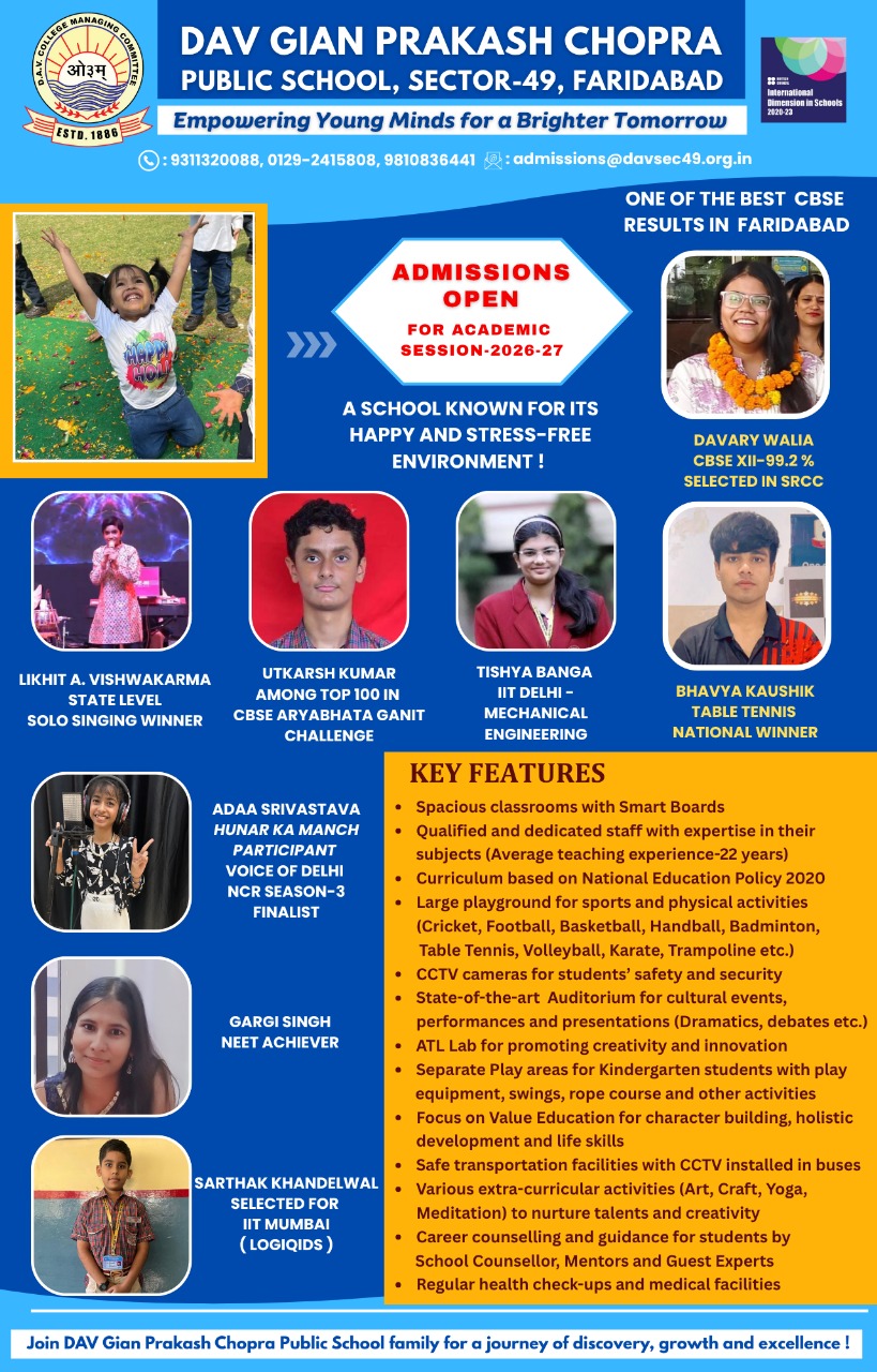 Life is a beautiful rainbow that reflects the hues of gaiety and peace, contemplation and action, yearning and contentedness, experience and enthusiasm. Impressions, experiences, grooming of childhood cast a life long influence on human personality. Hence, the role of home, parents, school, teachers is crucial. At DAVPS, Sainik Colony, Sec-49